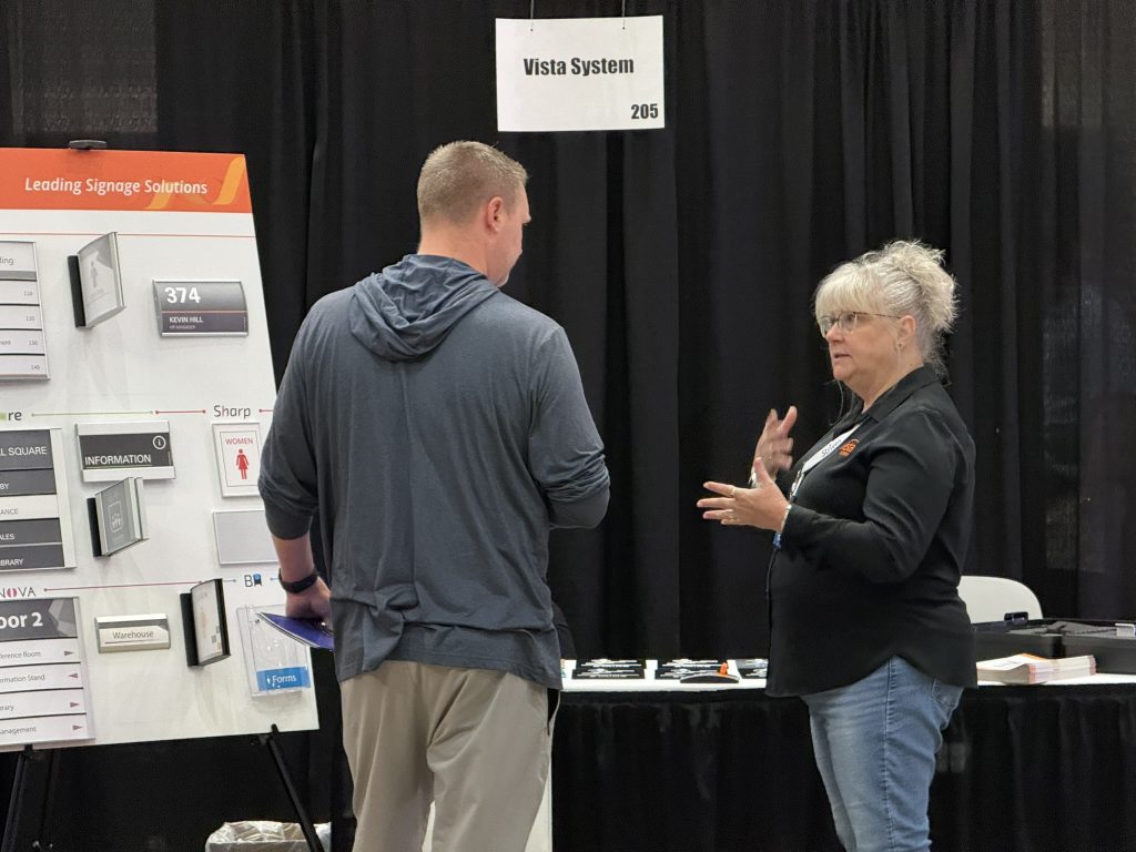 We showcased the latest technologies we use across our ADA signage solutions, highlighting how they help deliver accurate, compliant, and visually consistent signage for a wide variety of environments. Visitors had the opportunity to explore practical applications, discuss project requirements, and gain a clearer understanding of how Vista System solutions can support both functional and architectural signage needs.